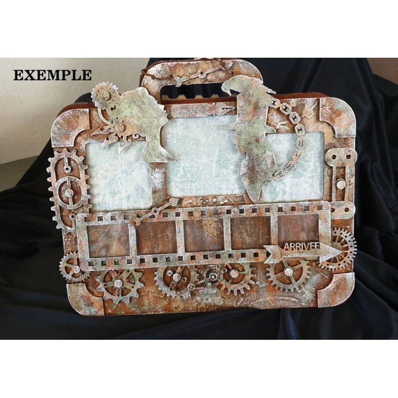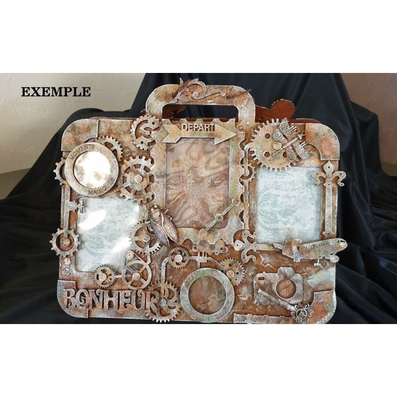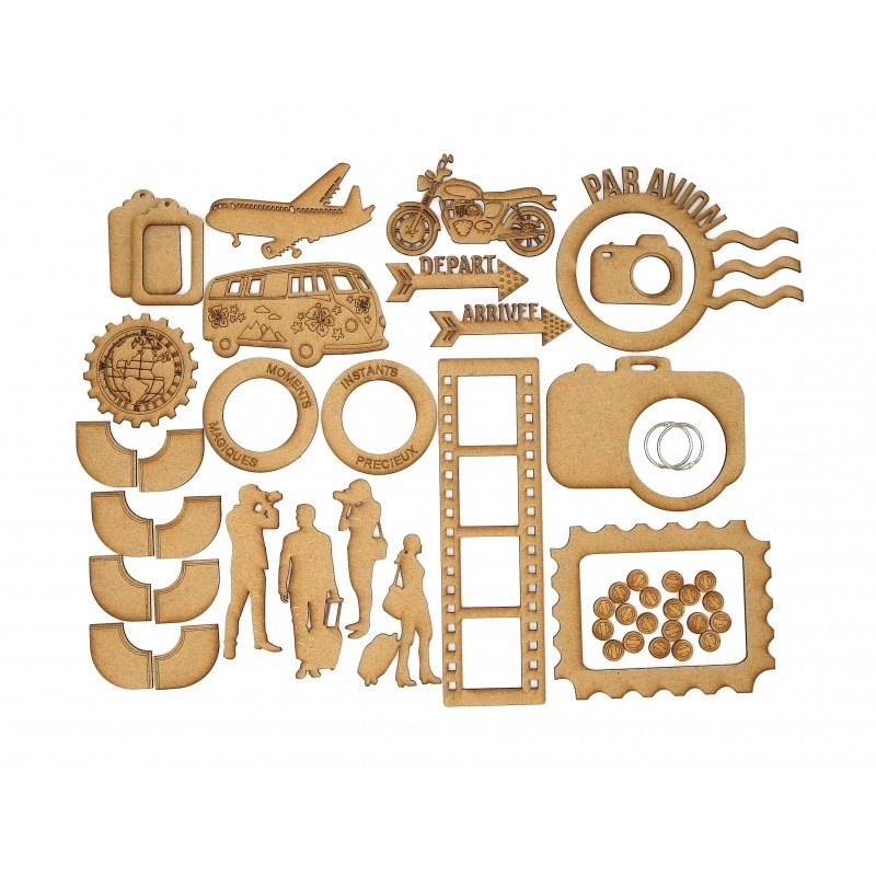 Contenu: cadre recto et verso, 1 pellicule, 3 cadres, 1 avion, 2 rondelles, 8 coins, 17 "têtes de vis ", 1 étiquette, 1 appareil photo, 2 flèches, 1 globe terrestre, 4 photographes, 1 van, 1 moto, 2 anneaux de reliure